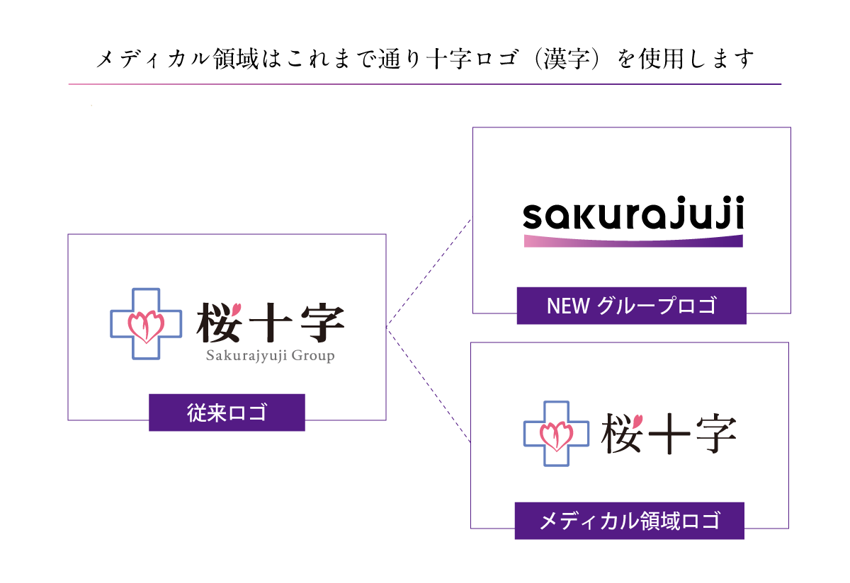 病院をはじめとするメディカル領域においては、患者さまやご家族にとっての安心感と視認性を重視し、引き続き従来の「桜十字」の漢字ロゴを使用します。(フォントのみ一部変更)
