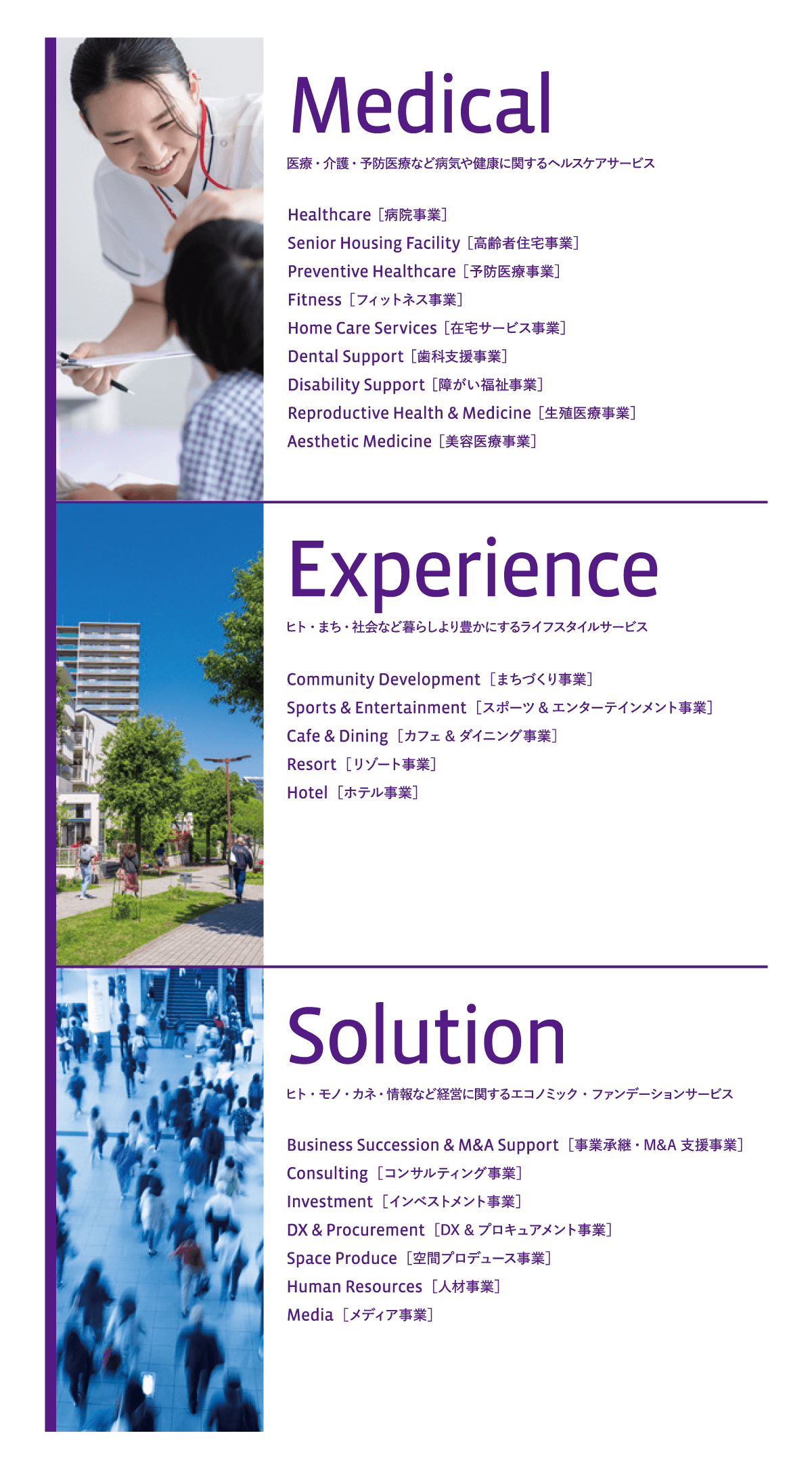 病気や健康に関するヘルスケアサービスを担う領域です。病院事業をはじめ、高齢者住宅事業、予防医療事業、在宅サービス事業、歯科支援事業、障がい福祉事業など、従来の医療・介護の枠を超え、一人ひとりの人生に寄り添いながら、健康を包括的に支えます。