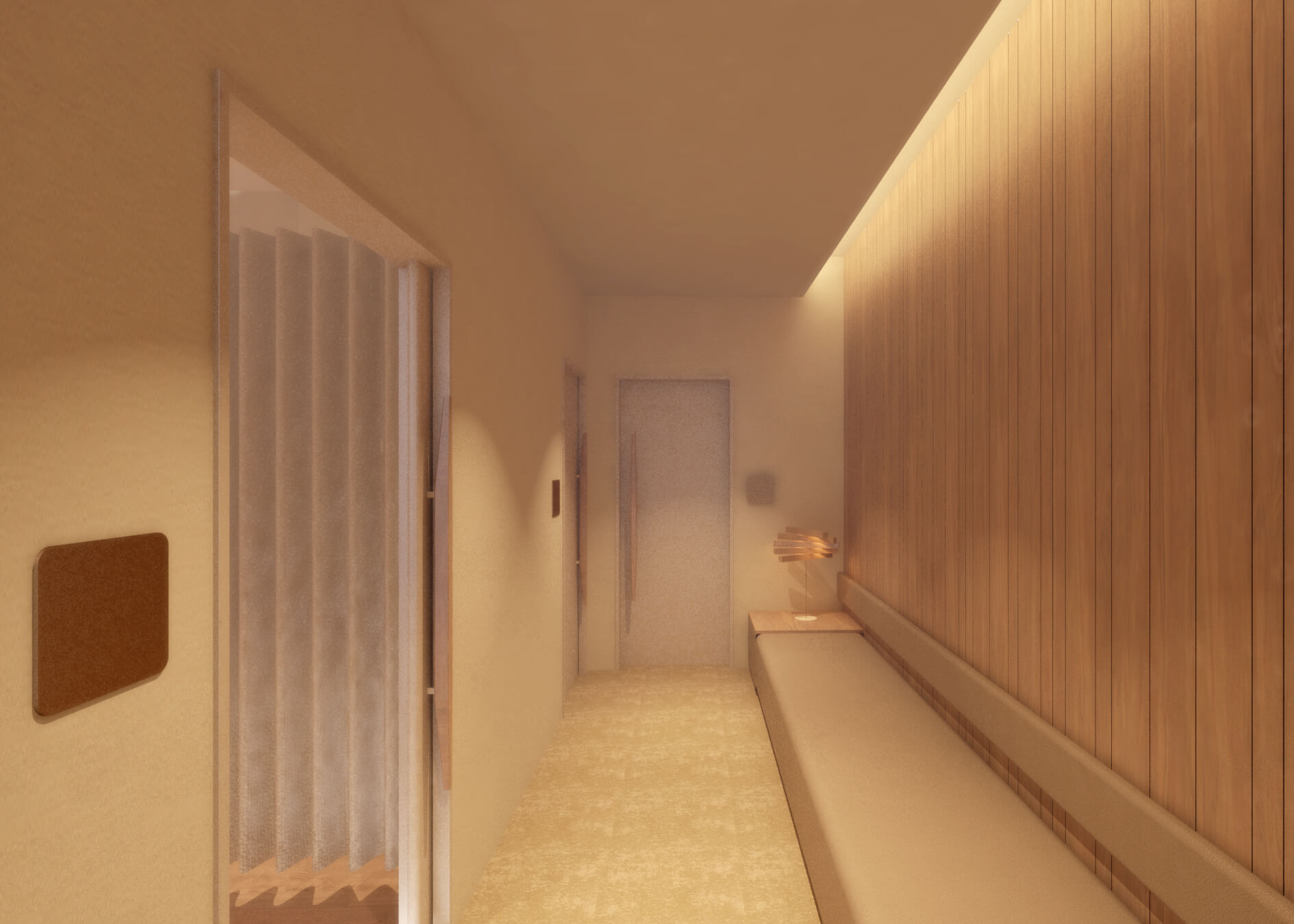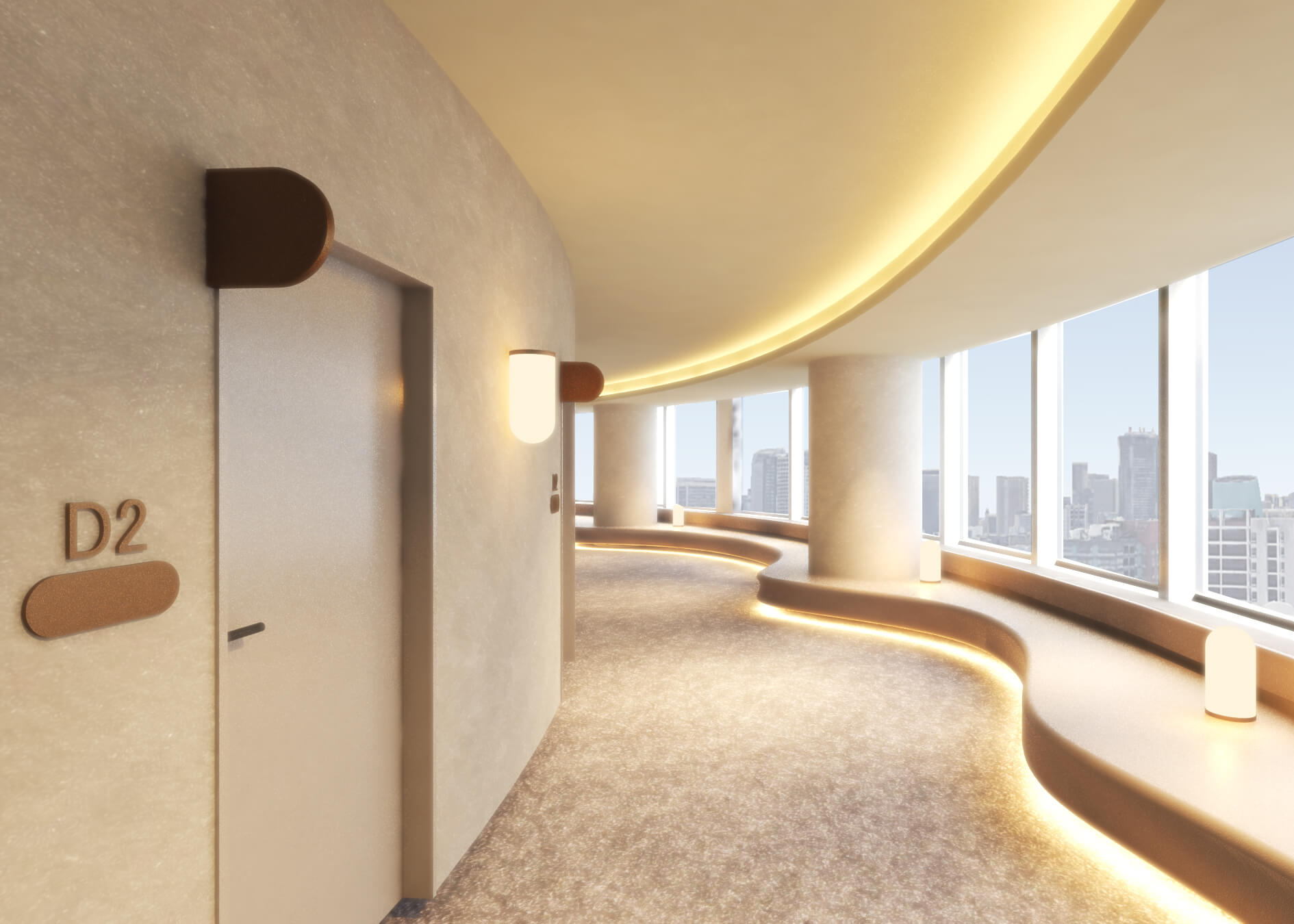 左官仕上げの壁や、木の素材を床や壁に取り入れることで、都市の中でも自然を感じられるやすらぎの空間になっています。この空間は、身体のリズムや呼吸をイメージしていて、健康診断中も心地よく過ごせます。